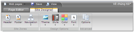 Bước 1: Tại khung Page Manager để tiện cho việc thiết kế bạn chọn Design Site>Design site trên thanh công cụ (hoặc chọn Edit ở một trang bất kì được liệt kê bên dưới). Trong cửa sổ Microsoft Office Live Small Business Web Design Tool, bạn sẽ thấy một cửa sổ làm việc tương tự như Microsoft Office 2007 nhưng chỉ gồm có hai thẻ Page Editor và Site Designer. Bây giờ, bạn đừng vội bắt tay vào việc thiết kế nội dung cho các trang mà hãy xây dựng một hệ thống các menu chính (cũng như menu thả xuống) và giao diện sao cho thật sự khoa học, định hướng tốt cho người xem.
