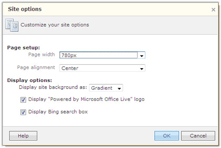 -Advanced: Một số thiết lập về trang web: độ rộng (Page Width), canh chỉnh (Page Alignment) và nếu không muốn hiển thị ô Bing search (ô tìm kiếm phía trên), ‘Power by Microsoft Office Live’ (cụm từ của Microsoft ở phía dưới bên trái) thì bạn bỏ dấu kiểm ở hai ô bên dưới mục Display Options.