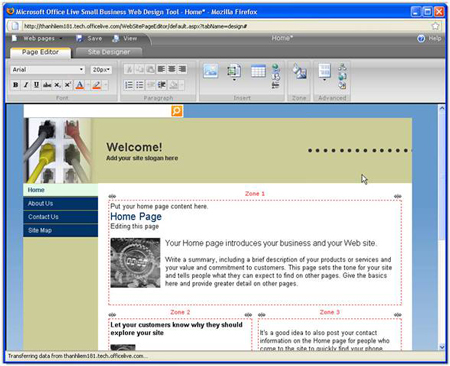 Khi đến với dịch vụ tạo website của Office Live, bạn sẽ được cung cấp miễn phí một dung lượng lưu trữ được xem là khá lớn với người dùng phổ thông là 500MB. Không những vậy, bạn sẽ nhanh chóng tạo cho mình một trang Web mà không gặp phải một khó khăn gì, bởi vì chắc hẳn ai sử dụng máy tính cũng đã dùng qua Microsoft Office. Website được bạn tạo ra từ dịch vụ này mang đầy phong cách chuyên nghiệp không thu kém gì với một website được lập trình bằng HTML. Bây giờ, bạn có thể bắt tay vào việc thiết kế website bằng bộ ứng dụng trực tuyến Office Live.