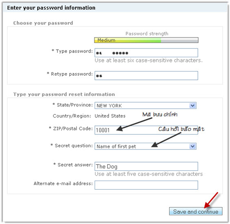 -Nhập mật khẩu ít nhất 6 kí tự vào hai ô Type password và Retype password; chọn tỉnh (thành phố, tiểu bang) tại State/Province; nhập số bưu chính tại Zip/Postal Code (số này phải chính xác, chẳng hạn như bang New York có số này là 10001); chọn câu hỏi bảo mật Secret question và trả lời ít nhất năm kí tự tại Secret answer; chọn email thay thế để OfficeLive gửi thông tin khi bạn quên mật khẩu tại Alternate e-mail address; rồi nhấn Save and continue.