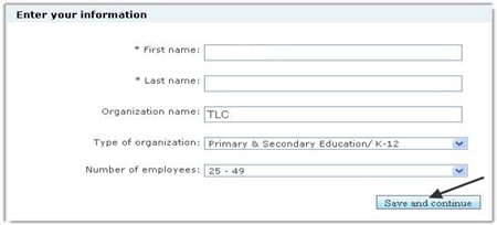 -Kế đến, bạn cần điền một số thông tin cá nhân tại mục Enter your information gồm có: First name-tên, Last name-họ, Organization name-tên tổ chức, Type of organization -loại hình tổ chức, Number of employees-số lượng nhân viên, rồi nhấn Save and continue.
