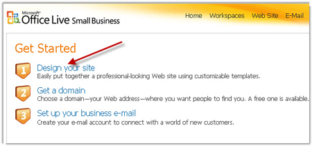 Khi đã kích hoạt xong tài khoản, bạn sẽ được OfficeLive cung cấp một tên miền miễn phí có địa chỉ nằm ở góc phải phía trên cửa sổ Get Started. Để bắt tay vào việc thiết kế web, bạn nhấn Design your site tại khung Get Started.