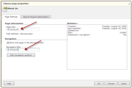 -Bạn phải tạo ra các menu chính trước tiên (tương ứng với mỗi menu là một trang), theo mặc định thì Office Live sẽ cung cấp bốn menu chính About US, Contact US, Home, Site map. Bạn có thể chỉnh sửa các menu này lại theo ý định của mình bằng cách nhấn vào menu đó rồi chọn thẻ Page Editor> chọn mục Advanced > chọn Page properties (biểu tượng <!--[if !vml]--><!--[endif]-->). Trong cửa sổ Choose page properties, bạn nhập tiêu đề trang tại ô Page title cũng như tiêu đề của nó trong bảng điều hướng (Navigation) ở ô Navigation title, rồi nhấn OK. Việc làm này cũng thực hiện tương tự như các menu khác.