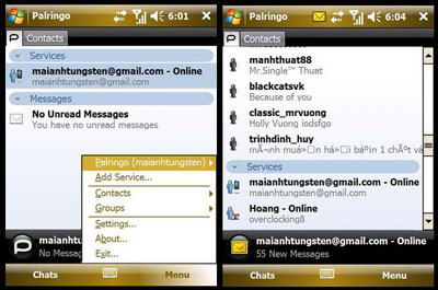 Palringo 2.6.3 là một phần mềm không phải là mới nhưng xin giới thiệu lại cho các bạn một tiện ích chat với nhiều tài khoản, mặc dù miễn phí nhưng có giao diện đẹp và rất hữu ích. Với Palringo bạn có thể chat dưới dạng chữ Text, hình ảnh và giọng nói rất dễ dàng. Những dịch vụ chat hỗ trợ: Windows Live Messenger (MSN), AOL Instant Messenger (AIM), Yahoo! Messenger, Google Talk, ICQ, Jabber, iChat/MobileMe, Gadu-Gadu, Facebook Chat