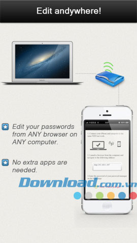 Tính năng nổi bật nhất của ứng dụng chính là khả năng truy cập thông qua kết nối không dây WiFi. Giờ đây người dùng có thể truy cập toàn bộ mật khẩu của mình từ máy tính PC hoặc Mac mà không cần mua hay cài đặt bất kỳ phần mềm nào khác.