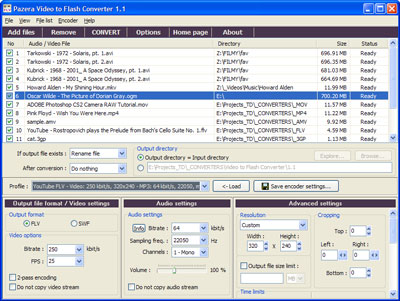 Hiện nay hầu hết các video clip được mọi người chia sẻ trên mạng tại các Website nổi tiếng như: YouTube, Google Video, Metacafe, Dailymotion … đều có định dạng FLV. Bởi ưu điểm lớn nhất của định dạng video này là dung lượng nhỏ gọn, chất lượng hình ảnh và âm thanh rất tốt. Và nếu bạn muốn chia sẻ các video clip mà mình có trong bộ sưu tập của mình với bạn bè trên mạng thì bạn cũng nên chuyển đổi các file video đó sang định dạng FLV. Và Pazera Free Video to Flash Converter sẽ giúp bạn thực hiện điều đó, chương trình có khả năng chuyển đổi các file video có định dạng: AVI, MPEG, MOV, MP4, 3GP, VOB sang định dạng Flash Video (FLV, SWF) để bạn upload lên Web và chia sẻ với mọi người. Cho phép người sử dụng tùy biến các tham số nén phù hợp.