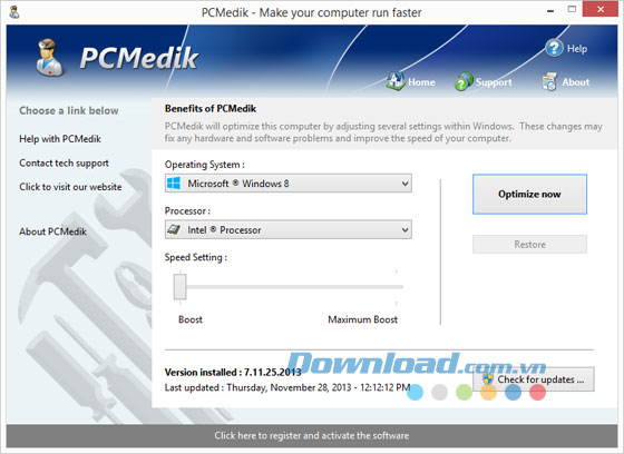 PcMedik là tiện ích tối ưu hóa máy tính, làm cho nó hoạt động trơn tru và ít bị lỗi hơn. Không những thế, với những thuật toán độc đáo, chương trình còn giúp tăng tốc máy tính của bạn để bạn luôn “lướt êm" trên xa lộ thông tin, không còn chịu cảnh ngồi đợi máy tính hoạt động với tốc độ “chậm như rùa”.