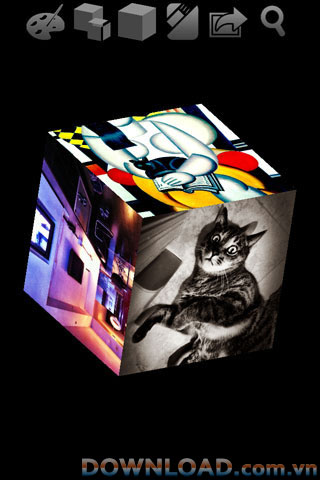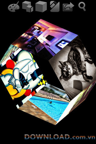 Photo Cube hỗ trợ người dùng xoay khối rubic hoặc để rubic xoay tự động. Bạn có thể chạm vào mặt rubic để đổi ảnh hoặc tự động chọn ảnh từ album ảnh.