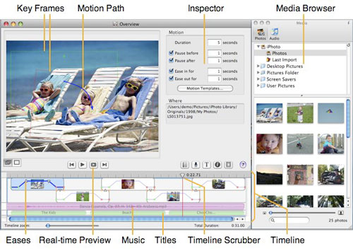 Hãy tìm trong thư việc của iPhone hoặc iTunes trong Photo in Movies để tìm ảnh và nhạc. Khi liên kết với iDVD, hãy tạo ra các DVD từ các slide show của bạn, bao gồm cả các chú thích và soundtrack. Bỏ qua nhưng giới hạn của hiệu ứng Ken Burns trong iMovie. Không còn những lo lắng về việc chỉnh sửa kích cỡ ảnh - Photo to Movie sẽ làm điều đó giúp bạn. Thậm chí bạn có thể sử dụng Photo to Movie để tạo ra những dãy ảnh có chất lượng cao trong Final Cut.