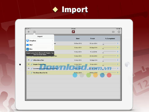 - Nhập dự thảo từ Microsoft Project thông qua dịch vụ đám mây Dropbox, Box, qua thư điện tử hoặc iTunes.
