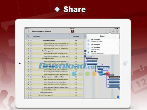 - Nhập và quản lý các dự án MS Project có sẵn dưới dạng tệp tin XML từ thư điện tử, dịch vụ đám mây Dropbox hoặc iTunes.
