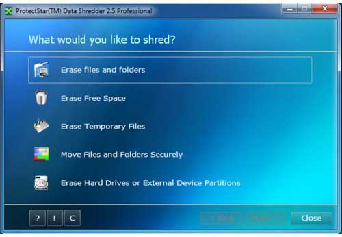ProtecStar Data Shredder có giao diện đồ họa rất thân thiện, dễ sử dụng được thiết kế để xóa bỏ dữ liệu an toàn bằng cách cắt nhỏ chúng và sử dụng phương pháp ghi đè với các dữ liệu ngẫu nhiên để không thể hồi phục với bất kỳ công cụ nào. Ứng dụng chỉ miễn phí với mục đích sử dụng cá nhân nếu sử dụng cho công ty hoặc thương mại thì bạn phải trả phí để sử dụng phiên bản Profession.