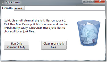 Quick Clean là một công cụ cho phép bạn dọn sạch các file rác khỏi máy tính chạy Windows của bạn một cách dễ dàng. Với một click nó cho phép bạn truy cập và chạy Disk Cleanup Utility sẵn có của chương trình và cũng dọn dẹp các file rác mà Disk Cleanup Utility không xóa bỏ. Các loại file bổ sung mà chương trình có thể làm sạch: .tmp, .temp, .chk, .old, .gid, .nch, .wbk, .fts, .ftg, .$$$, .err, .—, .~, ~., .??$, .___, .~mp, ._mp, .prv, .sik, CHKLIST.MS, .ilk, .aps, .mcp, .pch, .$db, .?$?, .??~, .?~?, .db$, .^, ._dd, ._detmp, 0.nch, chklist., mscreate.dir, .diz, .syd, .grp, .cnt and .~mp.