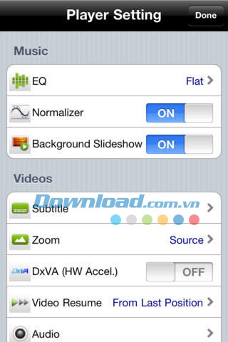- Thiết lập trình phát: thiết lập nhiều tùy chọn liên quan tới phát đa phương tiện như bộ cân bằng audio, tỷ lệ màn mình, phụ đề, hiệu ứng hình ảnh...).