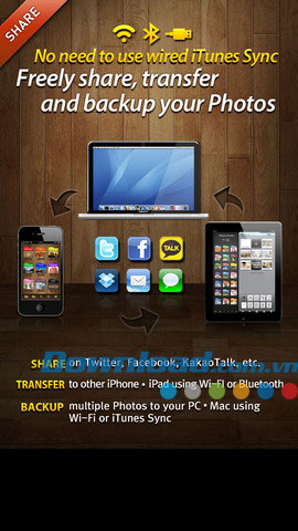- Chia sẻ: đăng tải ảnh qua mạng xã hội Twitter, Facebook, Helijet, Kakao Talk, Dropbox...