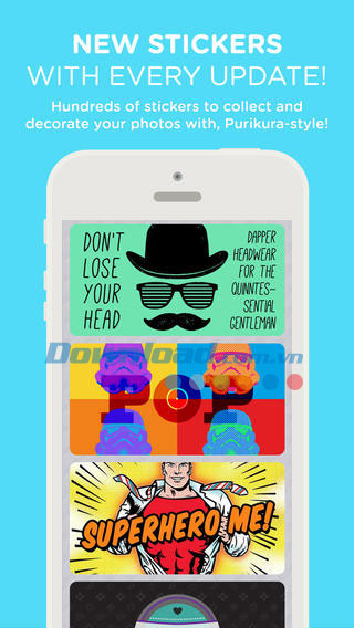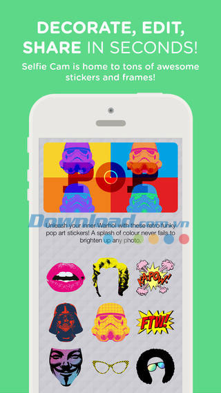 - Sử dụng hình dán siêu đáng yêu, khung ảnh để trang trí ảnh tự sướng. Hàng trăm sticker được cung cấp để người dùng thỏa sức tùy biến hình ảnh của mình theo nhiều phong cách khác nhau, từ hoạt hình cho tới nghệ thuật, trừu tượng.