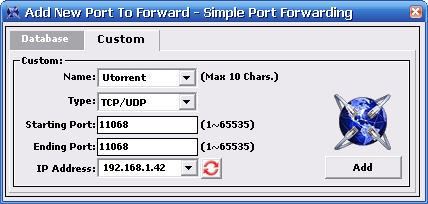 - Custom: Bao gồm các thiết lập cá nhân, cho phép bạn tự cấu hình mở port riêng đối với từng chương trình cụ thể. Ở đây, tôi tiến hành mở port cho Utorrent (Một torrent client phổ biến nhất hiện nay). Phần name bạn điền tên chương trình: Utorrent, phần giao thức (Type) tôi chọn TCP/UDP, điền port cần mở (ví dụ: 11068) vào ô Starting port và Ending port, ấn Add để hoàn tất.