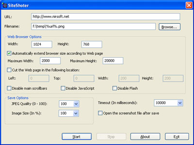 SiteShoter là 1 tiện ích nhỏ gọn và miễn phí cho phép bạn chụp ảnh của 1 trang web bất kì. Nó sẽ tự động tạo 1 cửa sổ Internet Explorer ẩn, load trang web chỉ định và sau đó lưu phần nội dung của trang đó dưới dạng 1 file ảnh (.png, .jpg, .tiff, .bmp hay .gif). Chương trình có thể hoạt động được cả ở chế độ đồ hoạ và chế độ dòng lệnh.