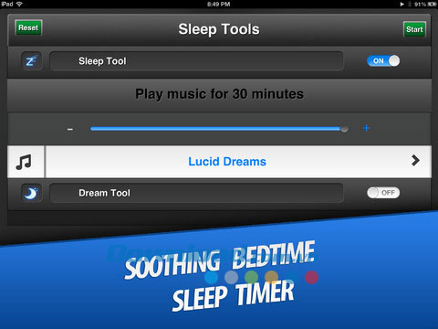 Với Sleep Tools for iOS, người dùng sẽ chìm vào một giấc ngủ ngon với những bản nhạc yêu thích, đoạn nhạc êm ái mênh mông, âm thanh beat lan tỏa khắp không gian hay âm đẳng thời rất tốt cho sức khỏe giấc ngủ của bạn. Tất cả những gì bạn cần làm chỉ là thông báo cho ứng dụng tổng thời bạn muốn nghe nhạc trước khi ngủ, ứng dụng sẽ tự động thực hiện phần còn lại.