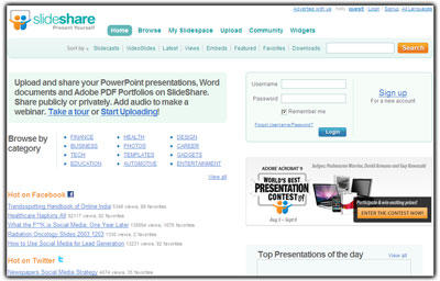 SlideShare là một trong những trang lớn nhất dành riêng cho định dạng tài liệu trình chiếu theo Slide. Các tài liệu dạng này khi đuợc tải lên hệ thống SlideShare sẽ được tổ chức gọn gàng bên trong các danh mục, đạt tốc độ nhanh và thao tác thực sự dễ dàng. SlideShare đồng thời có thể import các dạng tài liệu trình chiếu từ tài khoản Google Docs của bạn.