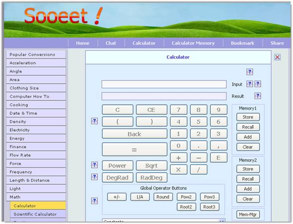 Sooeet là một dịch vụ miễn phí với giao diện website rất đơn giản và thân thiện, các hệ thống đo lường và đơn vị được bố trí ở thanh bên trái. Tính năng đầu tiên mà dịch vụ cung cấp là Popular Conversions giúp người dùng chuyển đổi các đơn vị thông dụng. Ngoài ra, còn có các hệ thống đo lường khác như Acceleration- gia tốc, Angle- số đo góc, Area- diện tích, Clothing size- đơn vị tính của quần áo, Computer How to- các loại đơn vị dùng trong lĩnh vực tin học, Cooking- đơn vị tính thực phẩm ở các nước, Date & Time- ngày và giờ, Electricity- đơn vị tính điện năng, Energy- năng lượng, Length & Distance- chiều dài và quãng đường, Light- đơn vị tính ánh sáng, Math- cung cấp các dạng máy tính cơ bản và chuyển đổi giữa các hệ đếm, Speed- vận tốc,…Nếu bạn chưa rõ cách tính hoặc chuyển đổi như thế nào thì có thể bấm vào dấu chấm hỏi ở phía sau ô nhập số liệu. Dịch vụ còn có một máy tính Calculator (ở thanh menu nằm ngang) nhằm giúp cho người dùng thuận tiện hơn trong lúc tính toán. Một tính năng khá hay khác là Chat, nó giúp mọi người trao đổi và học tập lẫn nhau.
