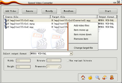 Speed Video Converter hỗ trợ nhiều dạng file video khác nhau, như AVI (DivX), MPEG-4, MPEG (VCD, SVCD, DVD compatible), WMV, ASF, Quick Time, VOB, và DAT. Phần mềm hỗ trợ Batch File Convertsion nó có thể chuyển đổi nhiều hơn một file chỉ cần một cái click.