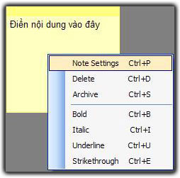 Sau khi cài đặt, biểu tượng chương trình sẽ nằm ở thanh taskbar. Click chuột phải vào biểu tượng này và chọn New note để tạo 1 nội dung mới. Hình ảnh 1 tấm giấy màu vàng sẽ hiện lên để bạn điền nội dung vào đó. Sau khi đã ghi đủ nội dung cần thiết (có thể sử dụng tiếng Việt), bạn click chuột phải vào hình ảnh của tấm giấy đó, chọn Note Settings để thay đổi thuộc tính của nó.