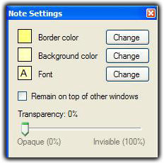 Cửa sổ Note Settings hiện ra. Tại đây, bạn có thể thay đổi thuộc tính, màu sắc của tấm giấy và thay đổi font chữ của nội dung bên trong. Đánh dấu vào mục Remain on top of Other Windows để đảm bảo tấm giấy ghi việc của mình luôn được hiển thị trên màn hình để nhắc nhở những công việc cần làm.