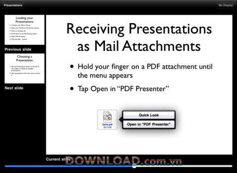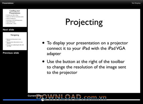 Người dùng PDF Presenter có thể sử dụng bộ kết nối VGA hoặc bộ kết nối AV tương thích để kết nối iPad tới máy chiếu và trình chiếu các bài thuyết trình một cách dễ dàng.