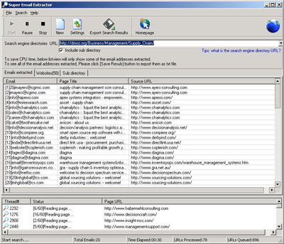Super Email Extractor là một trình giải nén email, thu nhặt các địa chỉ email và tên người sử dụng từ các trang web sử dụng HTTP protocol. Super Email Extractor không phụ thuộc vào bất cứ phần mềm phụ nào giống như các trình khác phụ thuộc vào Internet Explorer và có thể làm việc thông qua các proxy severs. Bạn có thể giới hạn mức độ quét. Chương trình linh hoạt và dễ sử dụng. Trong nhiều trường hợp, bạn chỉ cần gõ vào URL hoặc là 1 vài từ trong thanh tìm kiếm.
