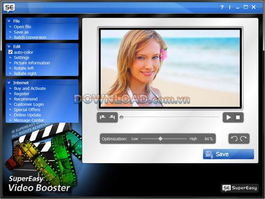 Phần mềm hỗ trợ chỉnh sửa những video rung và mờ, chỉnh lại độ sắc nét cũng như cải thiện phần âm thanh của video bằng công nghệ hiện đại nhất. Trước khi đăng tải video lên Youtube hoặc ghi ra DVD hoặc Blu-ray, bạn nên kiểm tra lại video với SuperEasy Video Booster để đảm bảo chất lượng tốt nhất cho sản phẩm của mình.