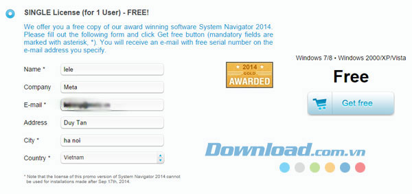 Truy cập vào LINK nhập đầy đủ thông tin vào form đăng ký, sau đó kích chuột vào nút Get Free. Vài phút sau đó sẽ có email gửi về cung cấp mã kích hoạt miễn phí.