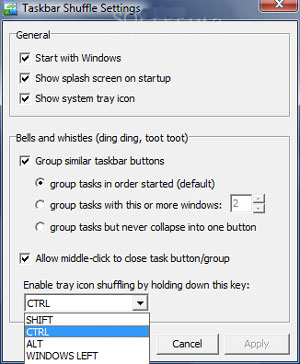 - Enable tray icon shuffling by holding down this key: Chọn một phím tắt cộng với thao tác kéo & thả chuột để thiết lập trật tự ưu tiên của các ứng dụng đang nằm trên khay hệ thống.