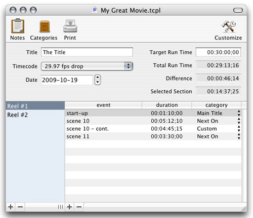 TCPlanner là một công cụ dành cho các chuyên gia phim ảnh như: đạo diễn, biên tập, nhà sản xuất. Chương trình này được thiết kế như một bảng thu hẹp cho phép lên thời gian cho buổi biểu diễn hoặc bộ phim. Những mục riêng của buổi biểu diễn sẽ được sắp xếp theo các mục và sự kiện cùng với tổng thời gian sẽ được tổng kết và so sánh với thời gian mục tiêu hoạt động.
