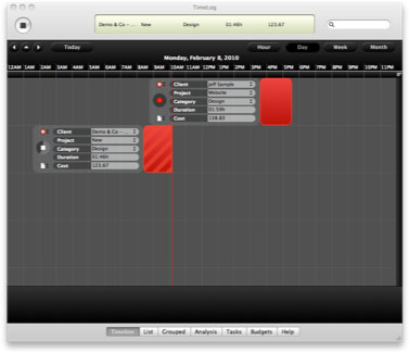 TimeLog phân tích lịch iCal của bạn và tính toán thời gian bạn dành cho các dự án của mình. Bạn có thể ấn định khách hàng vào các dự án từ MacOS X Address Book. Nếu bạn làm việc trên máy Mac khác có đồng bộ hóa với .mac, bảng thời gian của bạn vẫn luôn được cập nhật.