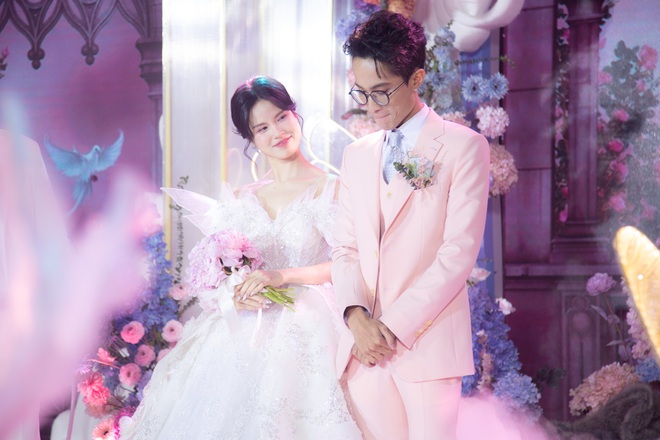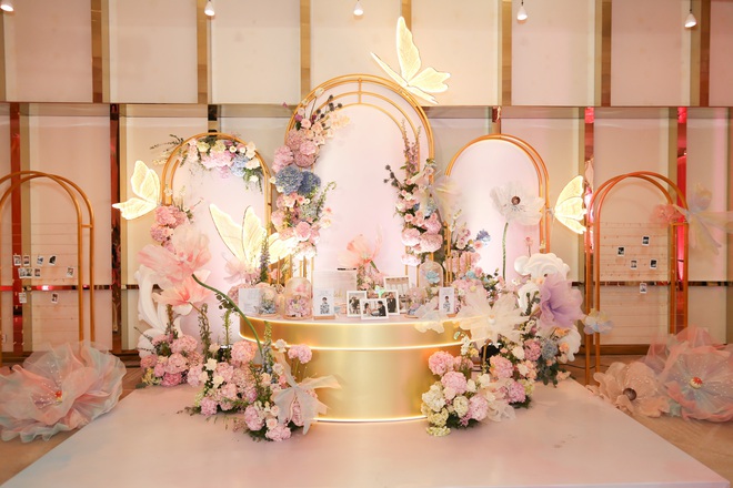 Cặp vợ chồng trẻ lựa chọn tone màu pastel nhẹ nhàng làm chủ đạo. Cùng với đó, hoa tươi kết hợp xen kẽ cùng hoa giả khổng lồ biến không gian trở nên như một khu vườn cổ tích. Khu vực sảnh check-in đến sân khấu bên trong hay bàn tiệc đều ngập tràn hoa. Theo tìm hiểu, Tizi và Đích Lép đã đầu tư đến hơn 1 tỷ đồng cho toàn bộ chi phí trang trí này.