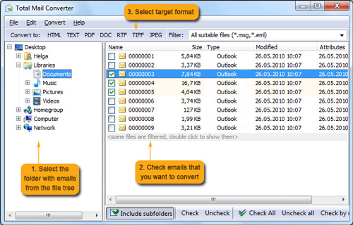 Total Mail Converter cho phép bạn loại bỏ được vấn đề nhiều email, lưu trữ chúng theo cách phù hợp với bạn nhất. Chuyển đổi MSG sang định dạng DOC, bạn có thể làm việc với dữ liệu này trong Word. Để xem email của bạn trong bất kì trình duyệt Internet nào, chuyển đổi MSG định dạng HTM. Total Mail Converter cho phép bạn giải quyết email ở bên ngoài ứng dụng email (Outlook, TheBat!, Thunderbird,...) giống như với các file TXT hoặc DOC hoặc RTF.