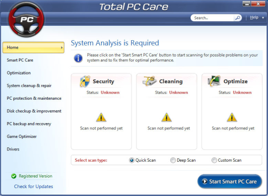 Bộ tiện ích hoàn tất giúp bạn dễ dàng sửa, tối ưu hóa và tăng tốc cho máy tính của mình. Total PC Care là một giải pháp tổng thể, nó có khả năng phát hiện tất cả các vấn đề chẳng hạn như lỗi registry, các vấn đề về đĩa, driver cũ, lạc hậu và nhiều thứ khác. Hầu hết các máy tính đều ở trạng thái được sử dụng khoảng vài năm, do đó thường có đến hàng trăm lỗi registry, các lỗi này góp phần làm chậm máy tính, một số có thể làm nó ở trạng thái treo, đổ vỡ và hoạt động ì ạch. Bộ tối ưu registry trong Windows được tích hợp bên trong Total PC Care sẽ quét Windows registry để tìm ra tất cả các entry lỗi, không còn hợp lệ, là nguyên nhân gây ra các tình trạng trên. Tất cả các thành phần của máy tính (màn hình, ổ cứng, RAM, DVD-Player, Printer,..) đều sử dụng driver để cho phép chúng hoạt động đúng chức năng của mình. Các driver cũ, lạc hậu hay bị lỗi chính là lý do chủ yếu làm cho các máy tính hoạt động không trôi chảy.
