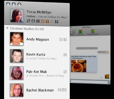 Trillian for Mac 6.2.17 cho phép bạn login bằng nhiều nick trên cùng một cửa sổ, đồng thời cũng cho phép bạn chat được một lúc với các tài khoản của AIM, ICQ, MSN, YAHOO, IRC. Trillian có giao diện đẹp, nhiều chức năng, hỗ trợ việc gửi file, xem webcam, hay chat voice. Trillian lưu trữ được các cuộc nói chuyện của bạn trong History. Ngoài ra, bạn có thể tinh chỉnh cách hiện messenger list trên cửa sổ chương trình về màu sắc, kiểu font, … Đặc biệt, Trillian hỗ trợ chat theo tab và mở rộng thêm nhiều biểu tượng chat.