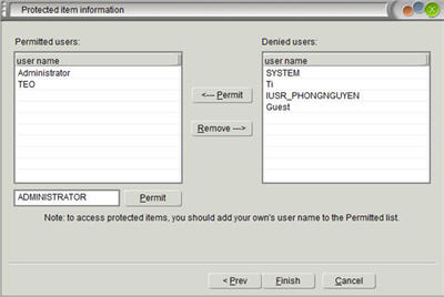 Khi chọn thư mục xong bạn nhấn OK, mặc định thì chương trình sẽ cấm tất cả các người dùng trong máy tính của bạn. Phần cửa sổ bên phải sẽ hiển thị những người dùng bị cấm, bạn muốn cho phép người dùng nào truy cập vào thư mục của bạn thì bạn chọn user đó và nhấn nút Permit, danh sách những người dùng tin tưởng sẽ chuyển sang trái màn hình,kết thúc bằng Finish và chọn Save.