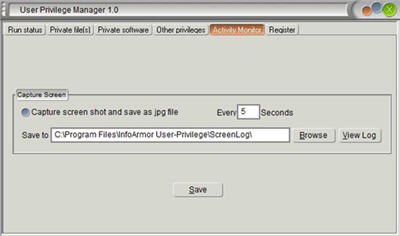 Nếu bạn muốn giám sát hành động của người dùng, bạn có thể định trong thời gian bao lâu chương trình sẽ tự động lưu lại màn hình làm việc một lần dưới dạng hình ảnh jpg. Nếu bạn không muốn sử dụng chức năng này thì đánh dấu chéo vào ô Capture screen shot and save as jpg file, và nhớ save lại khi cấu hình xong.