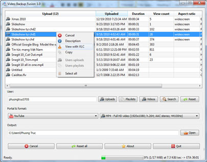 Bạn chỉ việc nhập tên thành viên cần tìm vào ô User rồi nhấn Uploads, hoặc nhấn Playlists nếu muốn xem playlist của thành viên này. Tìm xong, bạn nhấn chuột phải vào một clip trong danh sách, chọn Copy để tải về máy hoặc chọn View with VLC để xem clip bằng VLC Player. Khi tải, bạn chọn định dạng và chất lượng video clip dưới trường Portal & Format, đồng thời chọn thư mục chứa video clip tại ô Output.