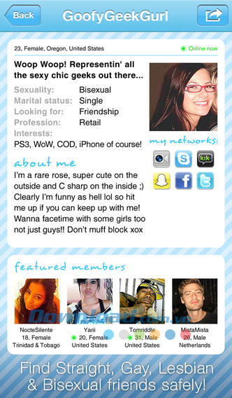 - Tích hợp Kik và Snapchat: thêm tên người dùng Kik và Snapchat ngay hôm nay. Truy cập hồ sơ của tôi > chỉnh sửa hồ sơ > mạng của tôi (lưu ý: chỉ có người dùng trong danh sách bạn bè mới có thể truy cập mạng của bạn).