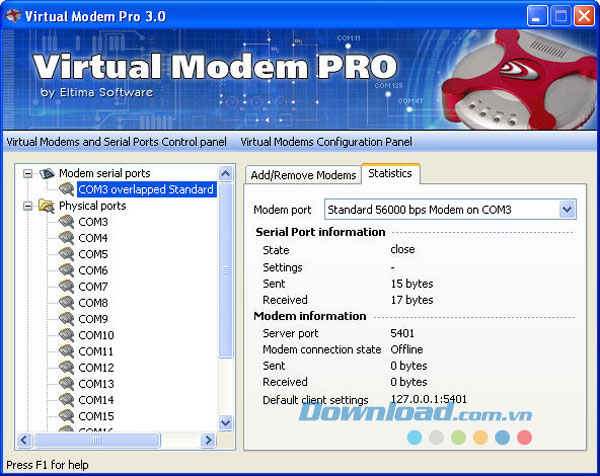 Cách tạo modem ảo bằng Virtual Modem Pro rất dễ dàng. Bạn chỉ cần nhấn vào nút “Add modem” là chỉ trong vòng vài giây, một modem chính hiệu mà máy tính xem như một modem thật sẽ được cài đặt lên máy tính của bạn. Chiếc modem ảo này sẽ được thiết lập như một “Standart 56000 bps Modem” trên máy tính. Bạn có thể xây dựng đến… 250 modem ảo trên máy tính mà mỗi modem sẽ tương thích với một cổng “COM”.