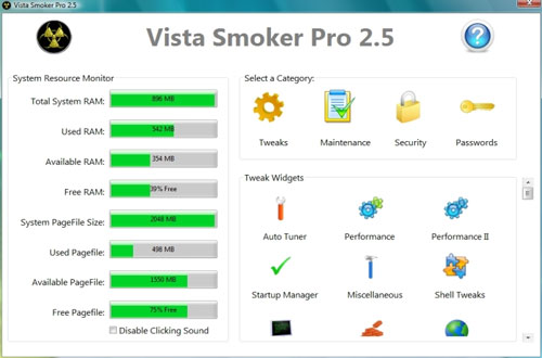 Nếu bạn đang tìm kiếm một công cụ nào đó để nâng cao hiệu suất cho Vista thì hãy thử công cụ này. Công cụ này được thiết kế cho phép tối ưu cách mà Vista hoạt động, từ bộ nhớ đến các hoạt động ổ đĩa rồi đến giao diện cơ bản. Bạn muốn tối ưu Vista khi chơi game? Tính năng GameBoost sẽ đóng một số dịch vụ và giải phóng RAM và các chu trình CPU. Bạn cũng có thể tối ưu ổ đĩa CD, cải thiện hiệu suất đồ họa của hệ thống, đóng các dịch vụ không muốn có và điều chỉnh IE với những mong muốn của bạn. Nếu không thích tính năng User Account Control của Vista, bạn có thể sử dụng chương trình này để thay đổi hoạt động của UAC. Ngoài ra, Vista Smoker Pro 2.5 thậm chí còn cho phép gỡ bỏ mũi tên trên các biểu tượng shortcut ở màn hình desktop. Nếu không muốn bận bịu với việc điều chỉnh hiệu suất một cách thủ công thì tính năng Auto Tuner sẽ thực hiện công việc này giúp bạn. Lưu ý ở đây là: Bạn nên tạo một bản sao trước khi sử dụng chương trình này; bằng cách đó nếu có điều gì đó xảy ra không như ý muốn thì bạn vẫn có thể quay về phiên bản ban đầu của hệ điều hành.
