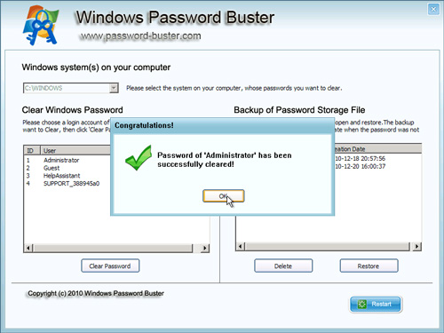 Windows Password Buster Professional là công cụ khôi phục mật khẩu Windows tốt nhất hiện nay. Phần mềm này được dùng để khôi phục mật khẩu người dùng và mật khẩu Administrator bị mất được dùng để đăng nhập vào hệ điều hành Windows. Đây là giải pháp dễ dàng, nhanh chóng và hiệu quả để khôi phục mật khẩu Windows bị mất hoặc bị quên. Nó có thể sao lưu file lưu trữ mật khẩu - Password Storage File - trước khi khôi phục máy tính của bạn trở lại trạng thái bình thường.