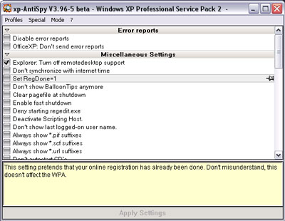 XP-AntiSpy là chương trình sẽ bảo vệ máy tính khỏi sự “do thám” của Spyware (phần mềm gián điệp) thông qua phương thức loại bỏ bớt những gì có liên quan đến kết nối Internet như các thông báo lỗi, tải các bộ giải mã codec, tự động cập nhật, giao tiếp messenger, chia sẻ ngang hàng... Ngoài ra, còn cho phép xóa các tập tin tạm, ẩn máy tính trên mạng nội bộ, gỡ bỏ Microsoft Messenger... Người dùng có thể tùy chỉnh để đạt được yêu cầu riêng cho máy tính cá nhân.